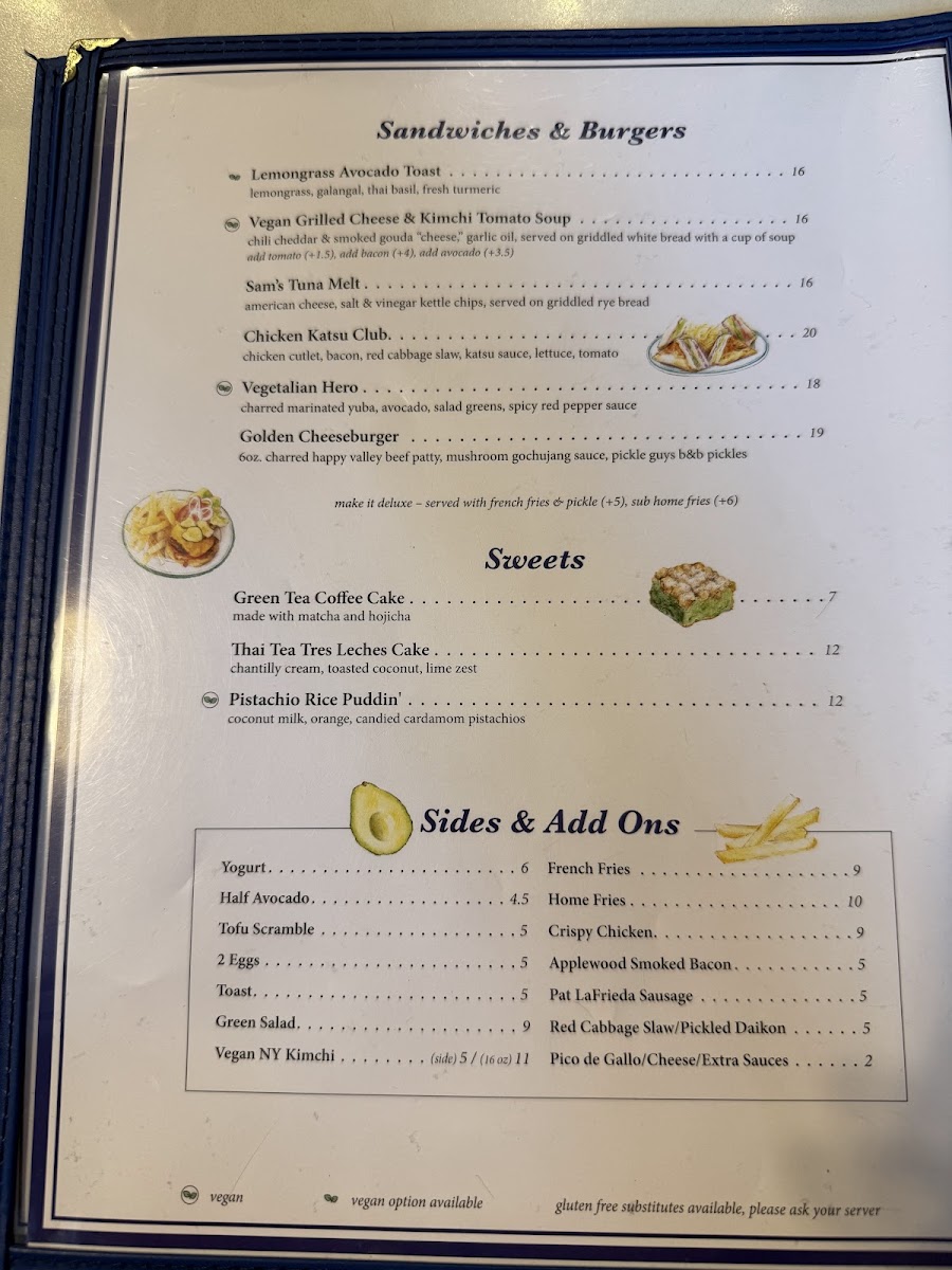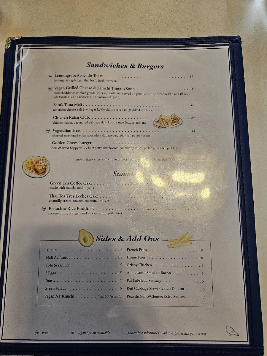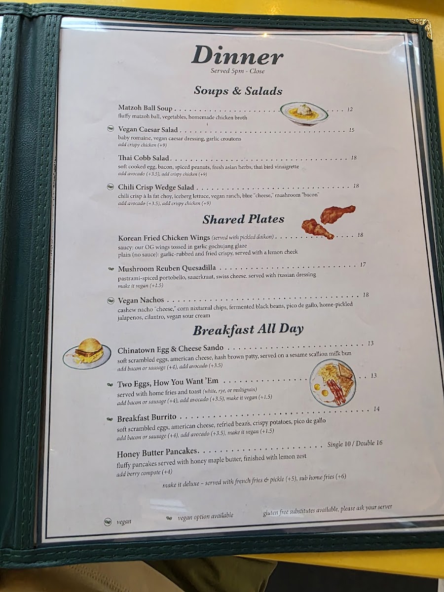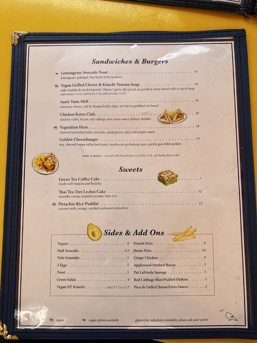 Start your morning with satisfying options like the breakfast burrito or the Chinatown Egg Sando, both served all day to fit those laid-back mornings or midday cravings. The Honey Butter Pancakes bring a unique texture and gentle hint of saltiness, making them a comforting choice for breakfast or even dessert. For lunch or dinner, you can enjoy hearty sandwiches such as the Chicken Katsu Club or the Golden Cheeseburger, alongside vibrant salads like the Thai Cobb or Chili Crisp Wedge, blending freshness with a touch of spice.